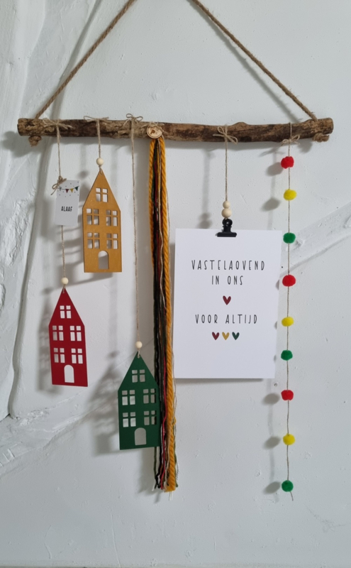De A4 kaart is gemaakt van 400 grams karton. De voorkant is wit met zwarte tekst en dots in de carnavals kleuren en de achterkant is blanco in wit.