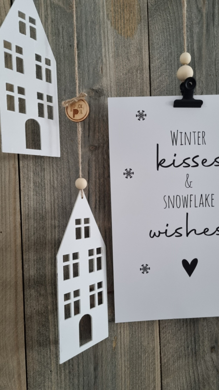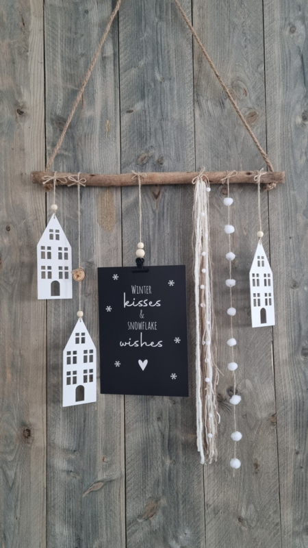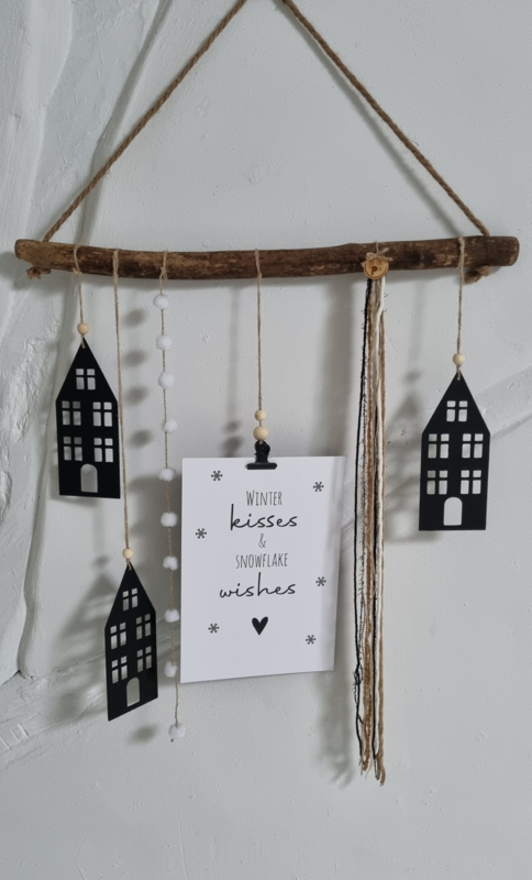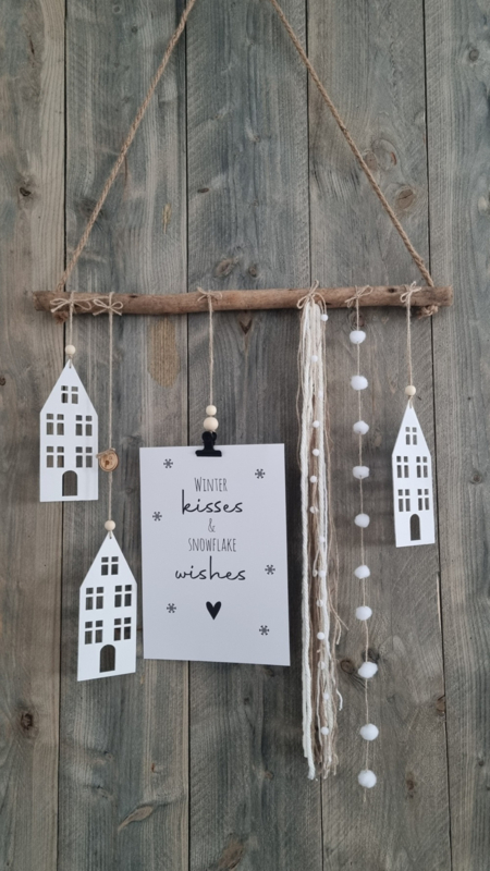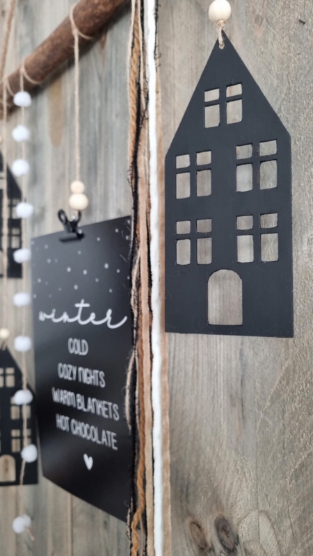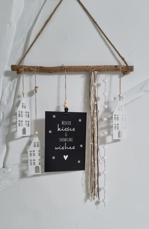 Met dit DIY pakket ga je aan de slag om een houten tak van 60 cm te decoreren voor de winter. Verf je eigen huisjes in een kleur naar wens, rijg de witte pompons op het jute touw en maak een bundeltje van de stukjes wol met jute touw. Maak alles met jute touw vast aan de tak en hang als laatste de A4 kaart met de zwarte klem aan de houten stok.