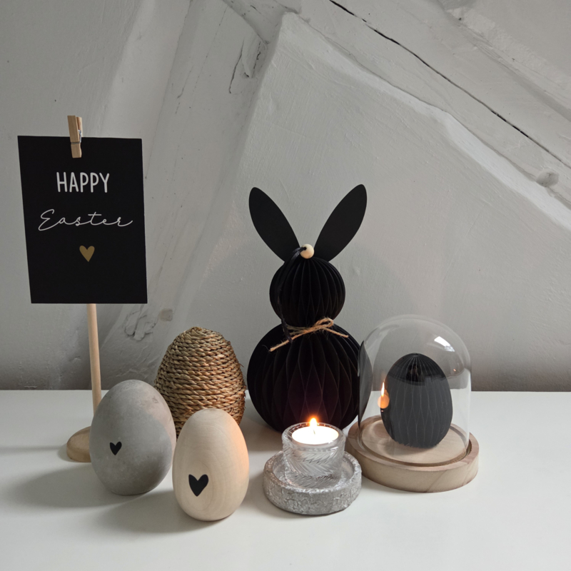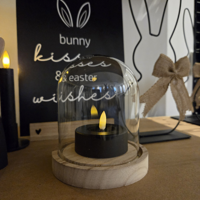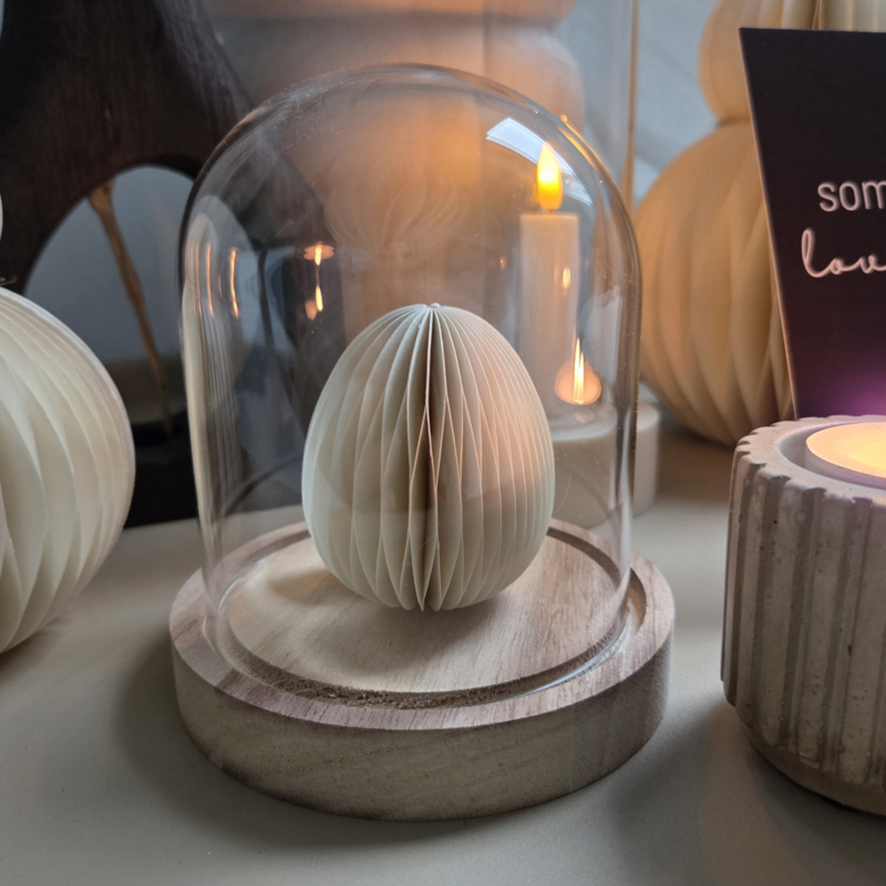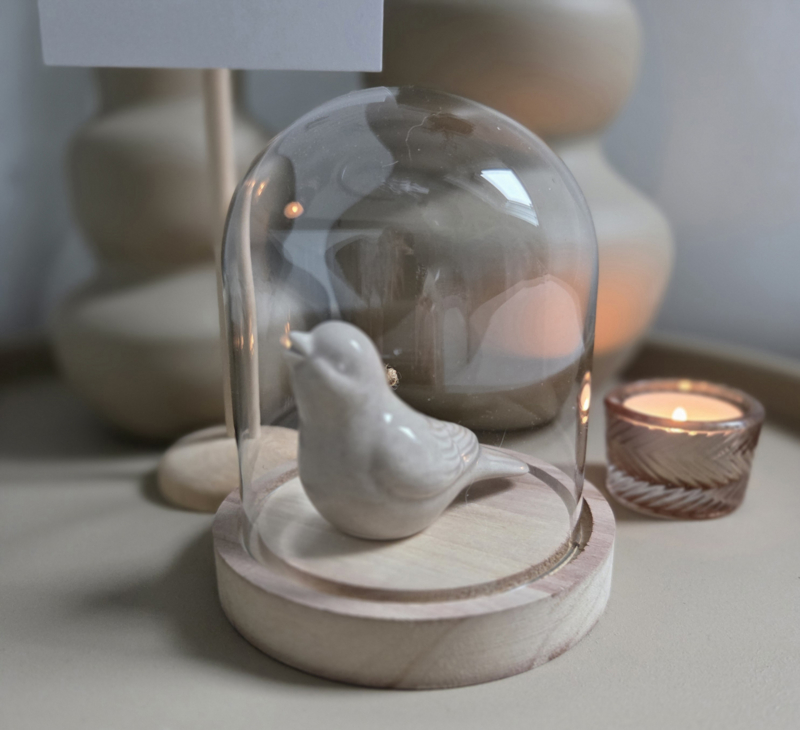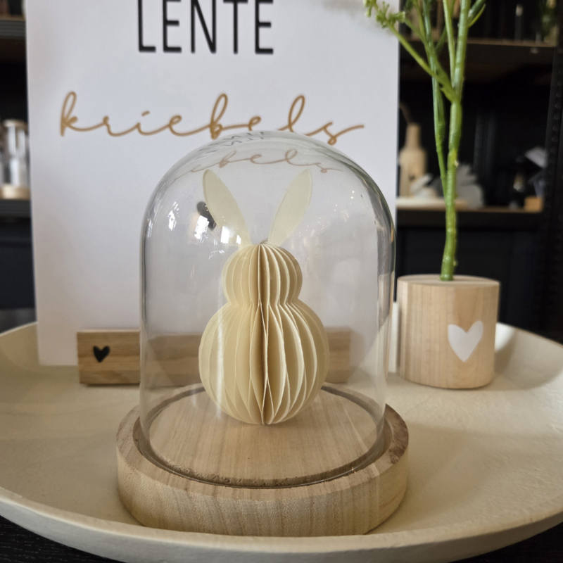 Decoratieve glazen stolp van 10 x 14 cm met houten voet. Perfect om kleine accessoires in te zetten zoals bijvoorbeeld mini papieren haasjes, LED waxinelichtjes of een houten ei.