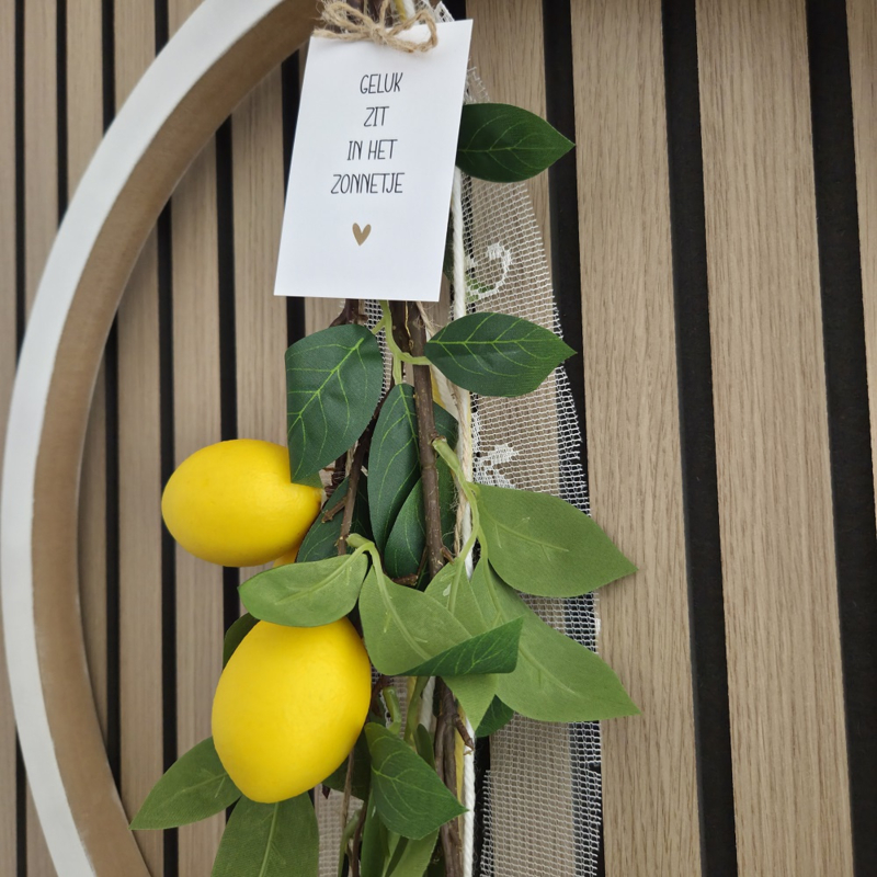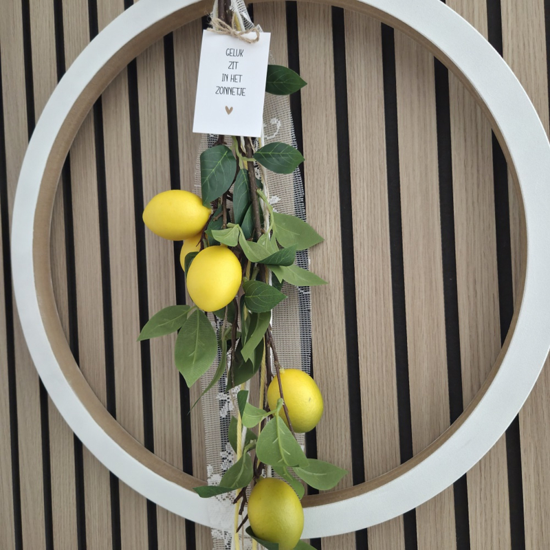 Met dit DIY pakket ga je aan de slag om een citroentak in een houten ring te maken. Deze ring van 50 cm kun je ophangen aan het raam of aan de wand. De houten ring verf je wit met de bijgeleverde verf. Hierna ga je de ring decoreren met het witte stofje, de stukjes wol in geel en wit en het jute touw. Als laatste maak je de citroentak vast aan de houten ring en hang je een minikaartje naar keuze aan de tak.